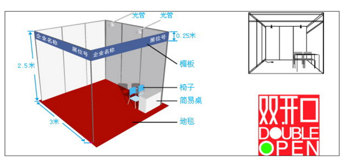 ■标准展位费用包括:展出场地、2.5m高壁板、楣牌制作、9平方米地毯、洽谈桌一张、椅子二把、10A/220V 单相插座一个,射灯二支。 ■空场地不带任何展架及设施,参展商可自行安排特殊装修工作或委托组织单位推荐的搭建公司。 标准展台示意图: 特装展台示意图: